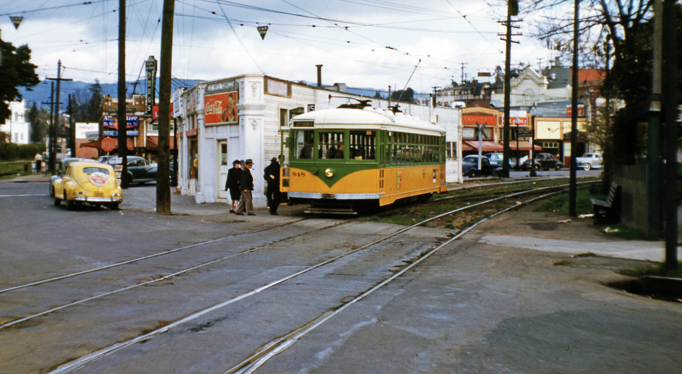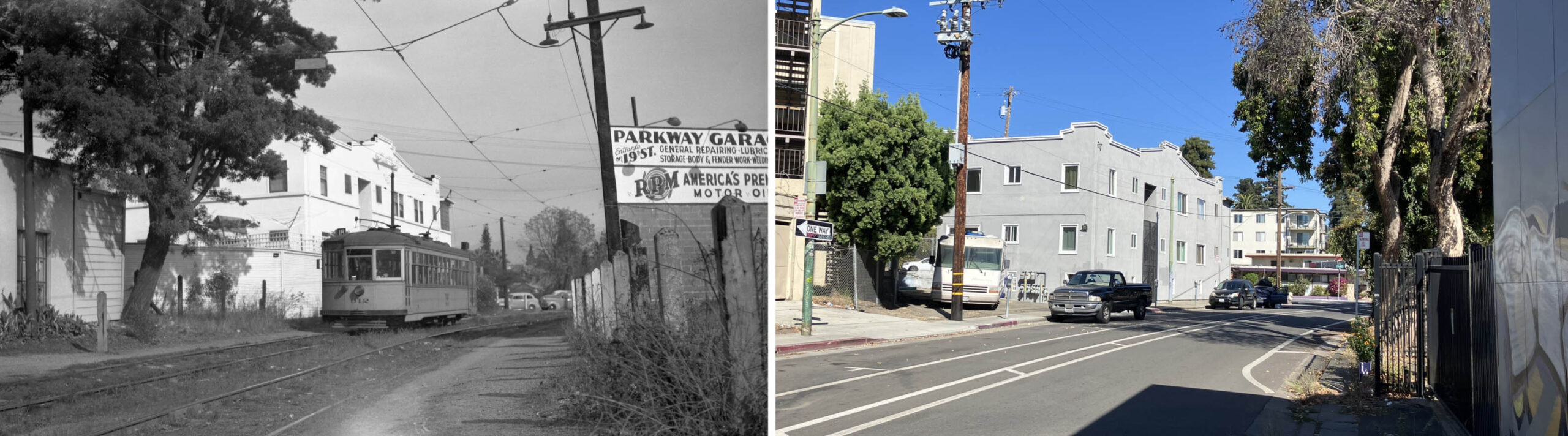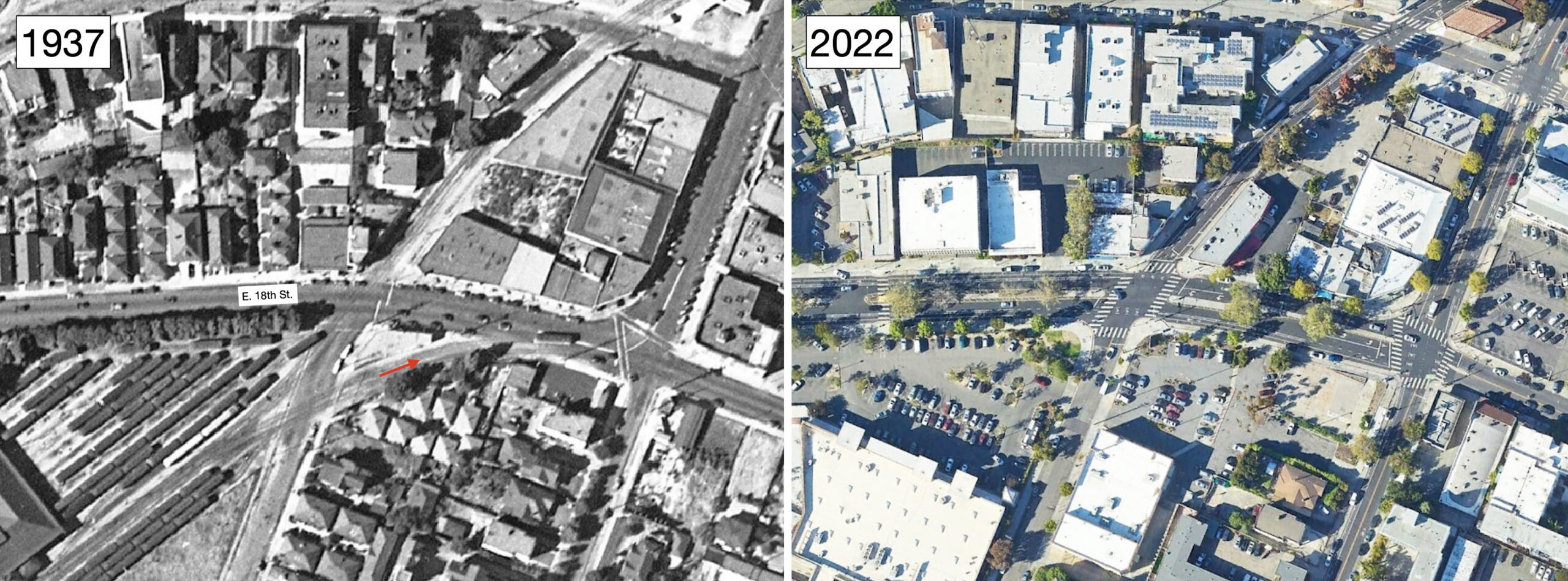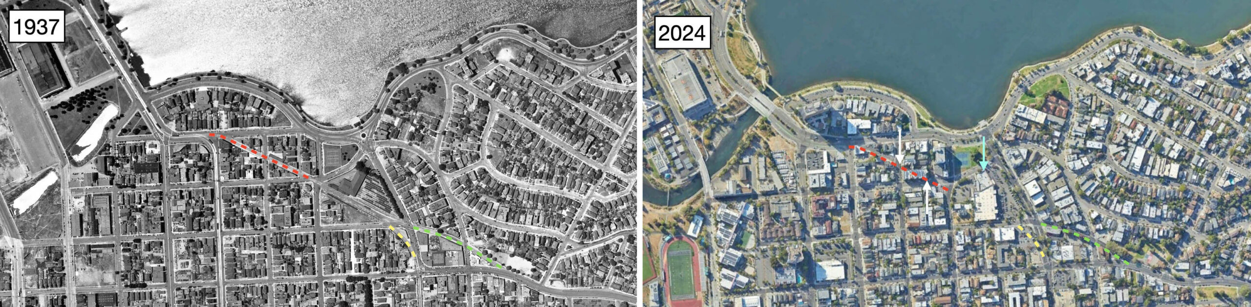 With the information just presented at hand, next to explore the E. 18th Cut, red arrow. The aerials from 1937 and 2024 are a reminder that nothing remains in 2025 of the cut’s existence or the structures on either side of it just reviewed. References to specific streetcar lines in the presentation that follows will go beyond the routes used in the late 1940s, as some images captured excursions, training runs or cars leaving storage. The KS streetcar division during the 1936-mid 1946 period was called East Bay Transit Co., but for this presentation, all cars are called KS, the designation after this time period.