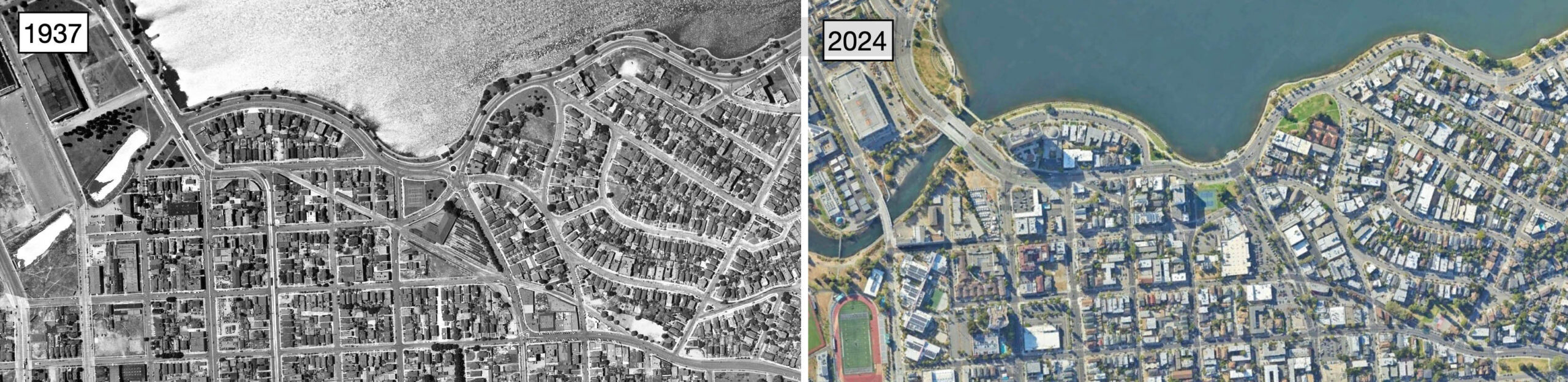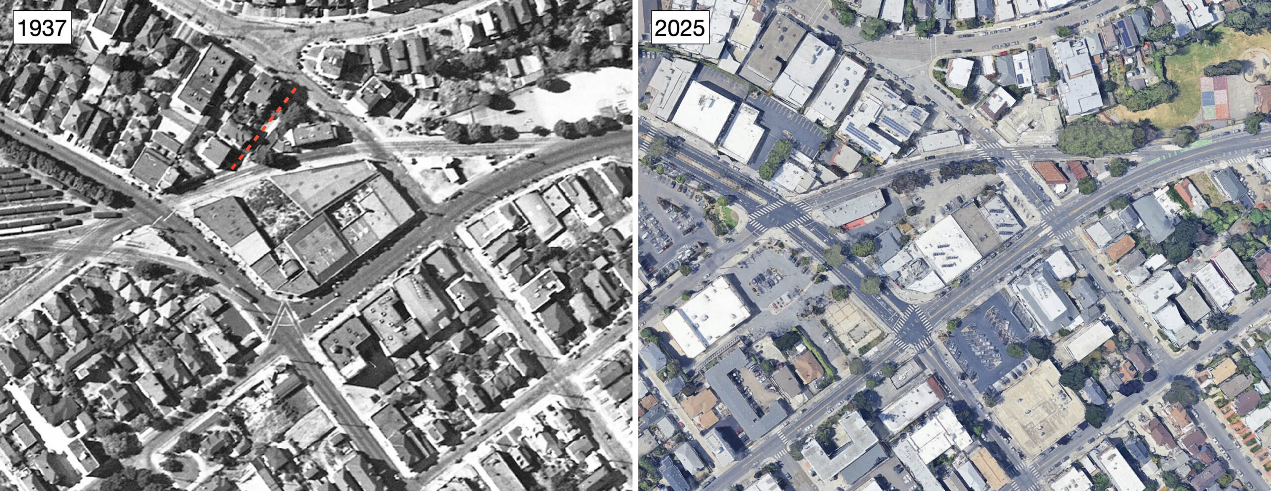 Side-by-side aerial views of the entire 3rd Ave. Cut from 1937 versus 2025 are displayed here. These aerials will serve as a second way to verify before-and-after ground views that follow. As one detail of interest, the pedestrian way that would allow access to the streetcar from Athol Ave.-Wayne Place is indicated by the red broken line, left, obliterated in 2025, right.
