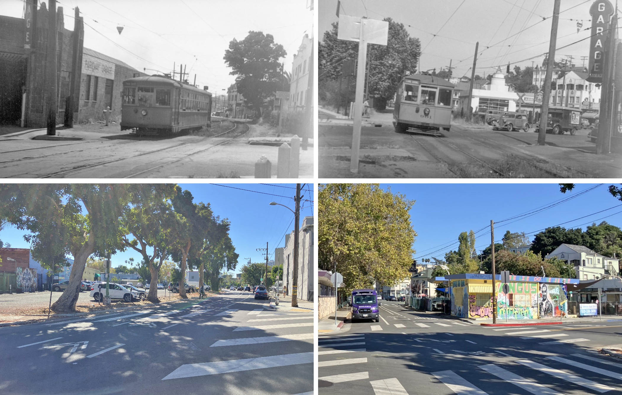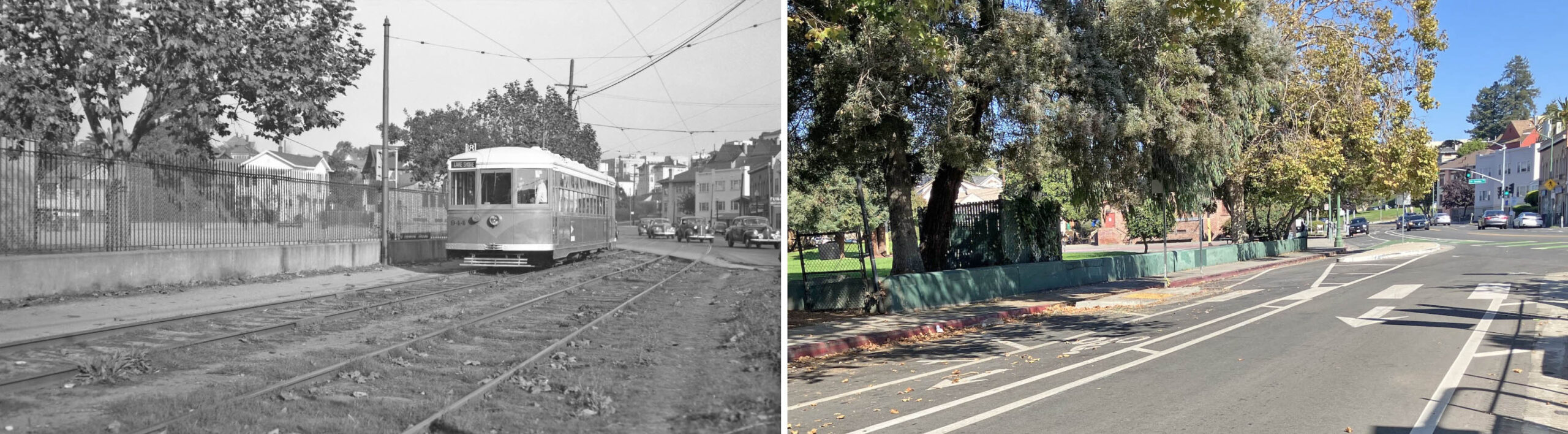 This update will begin where the last one left off, that is, where the two private right-of-ways to and from the Key System, KS, Central Car House originated northeast from the facility. In 2025, the area of interest is hard to photographic in the fall due to trees. Google Maps took the image shown here in Jan. 2023 when partial visibility was available. What looks like an unremarkable intersection at 3rd Ave. and E. 18th St. in this northeast view was once a high volume streetcar crossing in the first half of the 20th century.