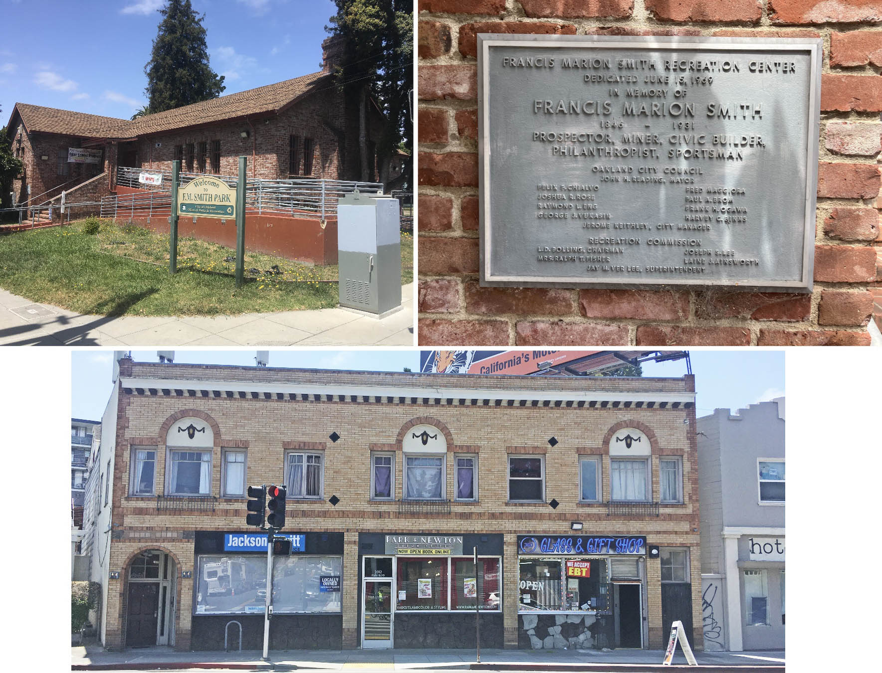 A west view of the recreation center from 2024 is shown on the top left, the plaque marking its renaming on the top right. Aside from Borax Smith, railway connections also exist for the architect who designed the building across from the end of the cut at nos. 2010-2016 Park Blvd. with its fine brick work, mouldings, and masonry constructed in early 1925 (Permit no. 95804, 09/10/1924.) Architect Clay Burrell, who designed many commercial and apartment buildings in Oakland, including the California Hotel and the Lyons building, also converted the exterior of the former car and power house for the Consolidated Piedmont Cable Car Company to the Cox Cadillac Showroom, today Whole Foods Market at Harrison St. and Bay Pl.