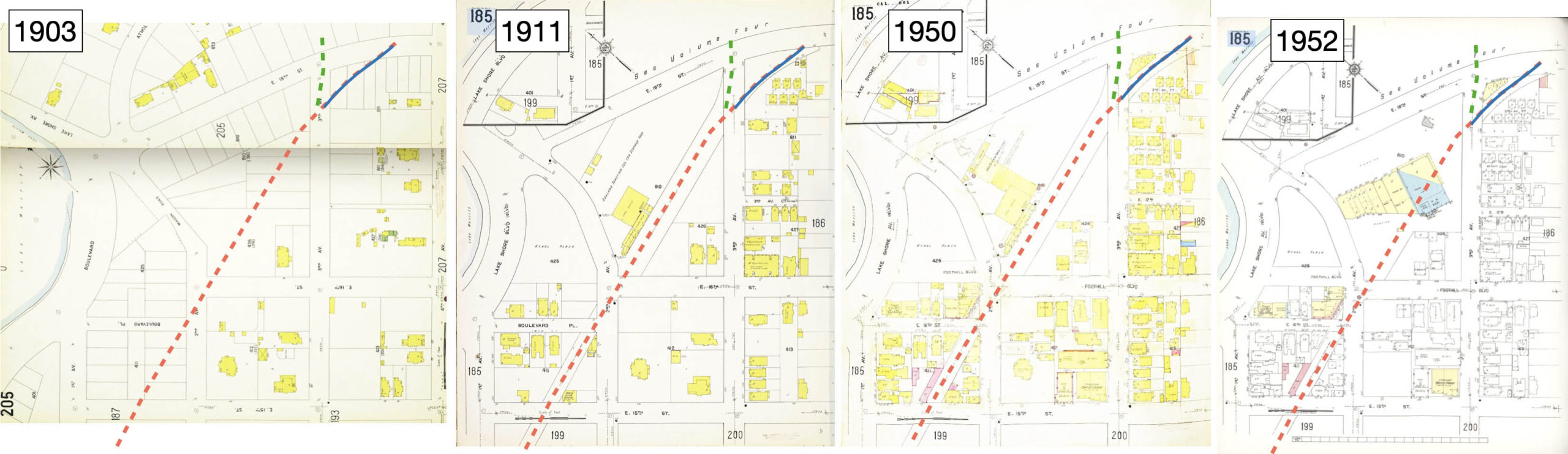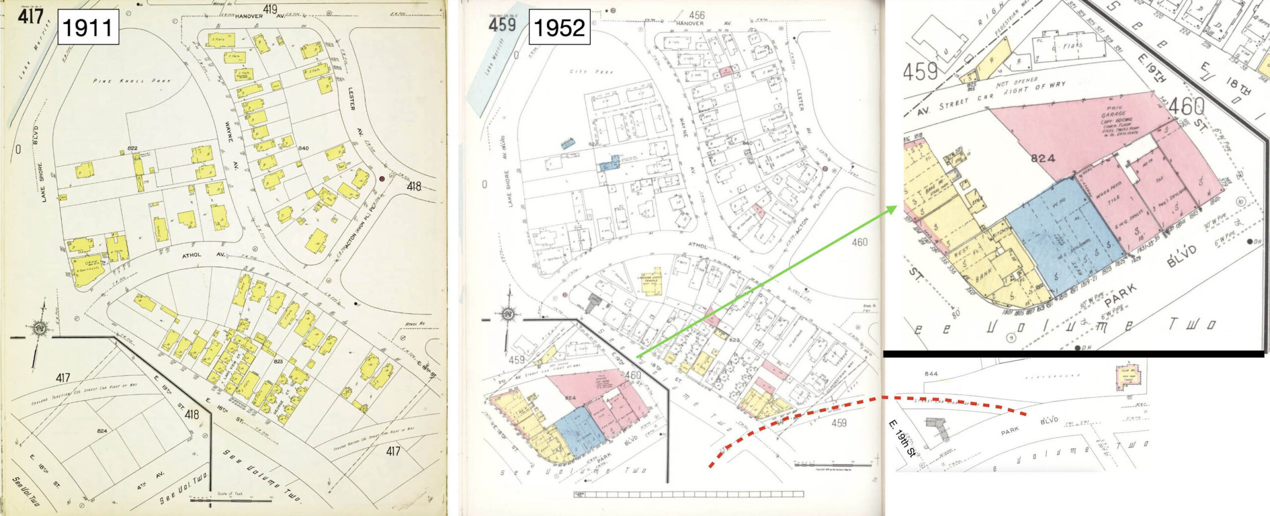 The cut from E. 18th St. to the entry onto Park Blvd. is shown in the Sanborn maps in the center and right from 1952. The insert on the top right shows the pedestrian way and the auto repair shop that no longer exist, while the one on the lower right shows the playground that was renamed Smith Park, to be discussed soon.