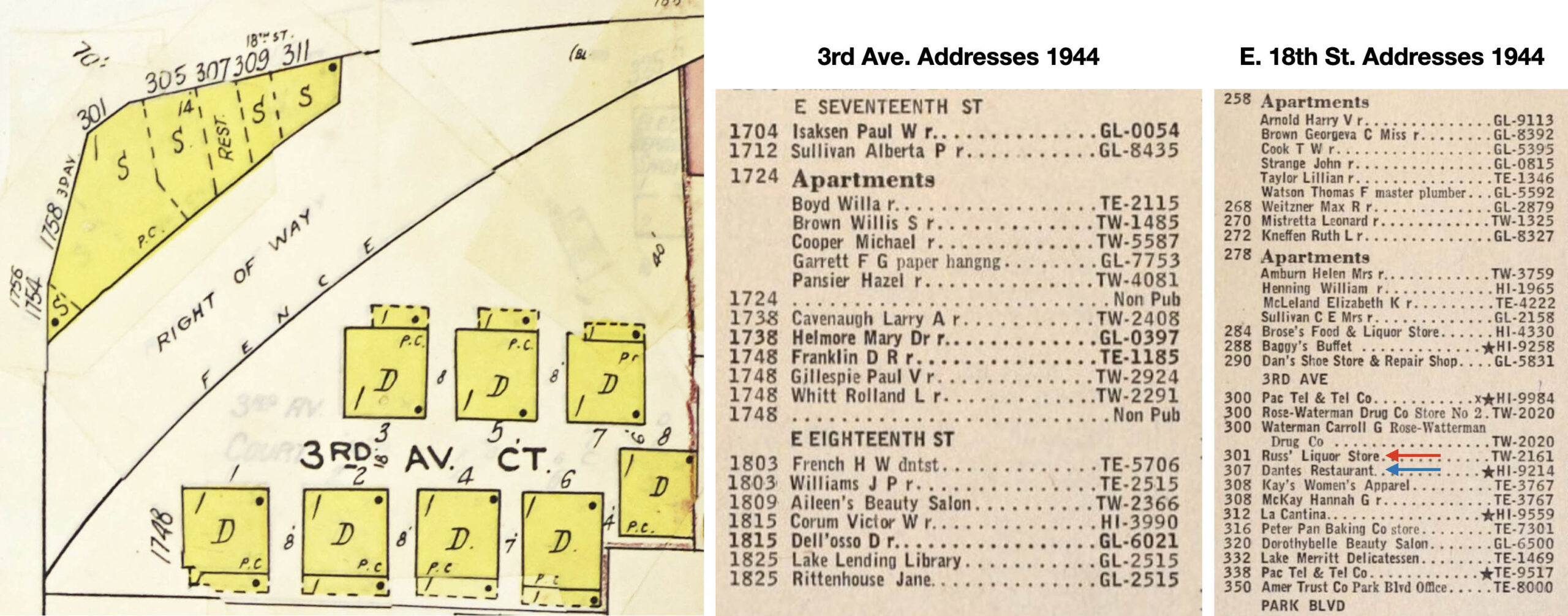 This enlargement of the Sanborn map updated to 1950, left, shows the numbering of the storefronts on the 3rd Ave. and E. 18th St. sides of the triangular building, and the cottages in 3rd Ave. Ct. The listing of addresses in the reverse directory from 1944 have only two of the structures, not ruling out the others were occupied without phone service. The liquor store at no. 300 changed names frequently, Brose Wine and Liquor Store in 1938, and Consolidated Liquor Store in 1940. Interestingly, no. 309 was listed as a residence for Esther E. Roy in 1940.