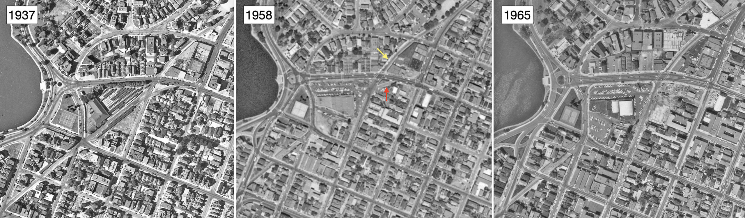 Documentation could not be found to establish the timeline of the usage and elimination of the E. 18th St. Cut once the KS tracks were removed. The aerial from 1958 shows a more squared- off version that appears to be paved, red arrow, center, as well as the 3rd. Ave. Cut, yellow arrow, center, that survives into 2025. The aerial from 1965, right, suggests the E. 18th Cut was eliminated close to the time when this image was taken, as well as elimination of many of the cottages to the east and south prior to any new building construction.