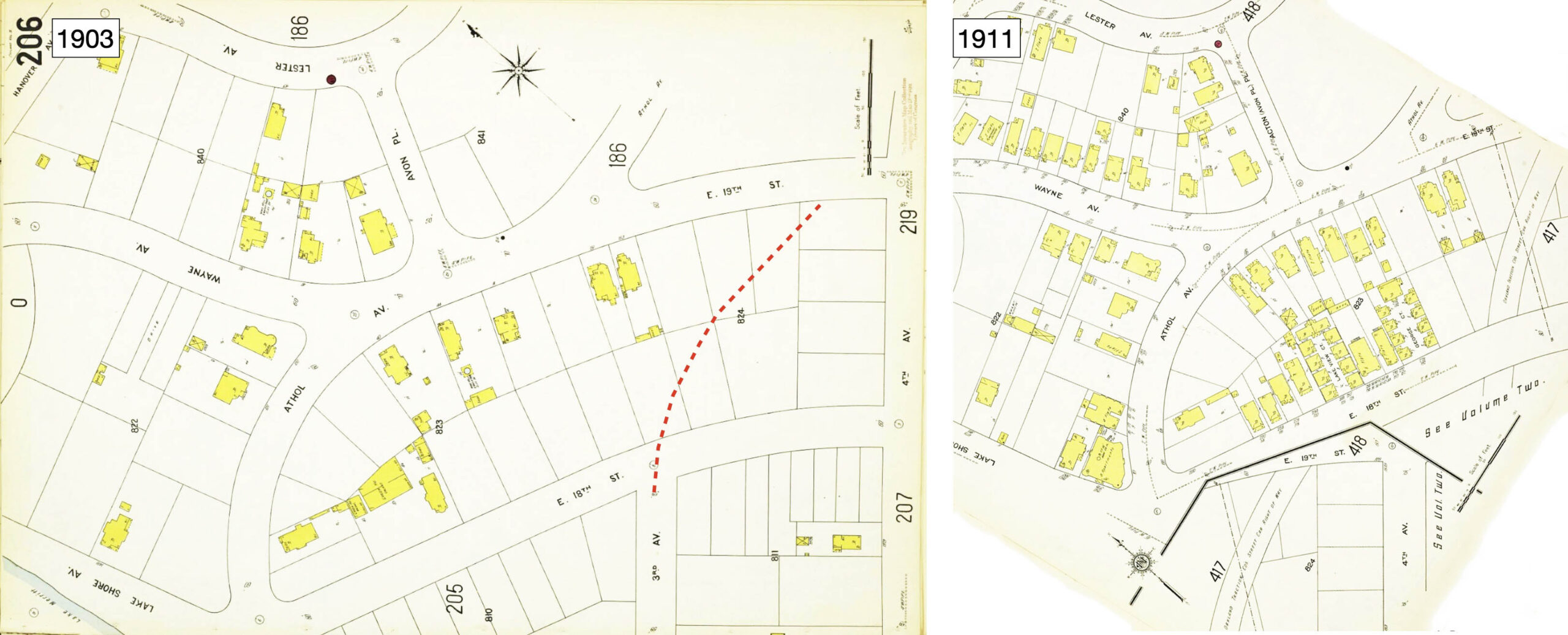 Next to the 3rd Ave. Cut. The Sanborn maps for this section of Oakland are oddly arranged, but this set of images documents that creation of the corridor for the Park Blvd.-bound streetcars did not remove any structures and was still in in open territory in 1911.